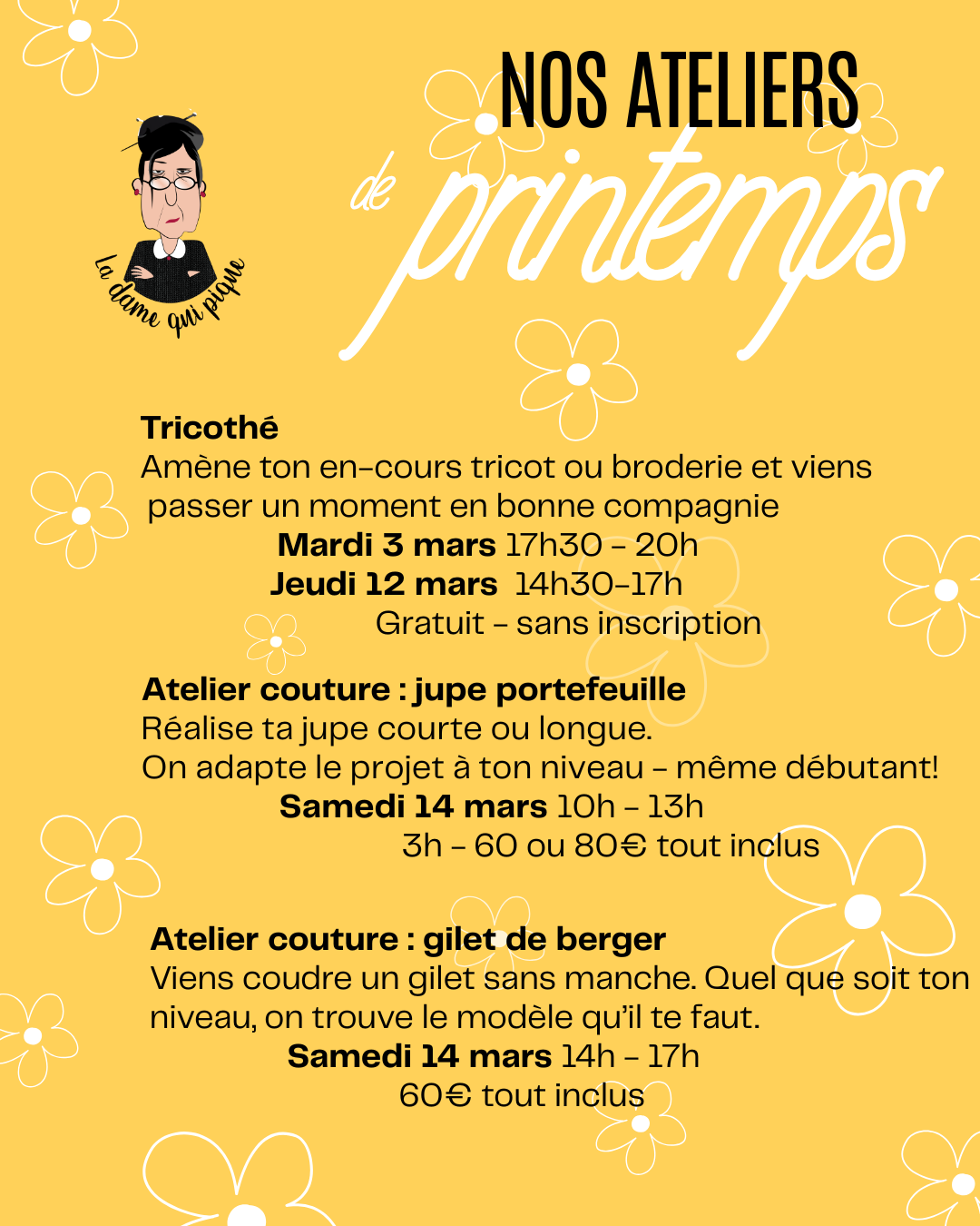 Chaque atelier sera composé de 6 personnes maximum et sera animé par La dame qui pique ou d’autres intervenants spécialisés dans le tufting, la tapisserie, la broderie sur laine, la customisation, le surcyclage (upcycling)… avec mise à disposition du matériel. Comment créer son tee-shirt, réfléchir à sa garde-robe idéale, choisir ses patrons en fonction de sa morphologie… Rien n’est figé. La dame qui pique est à votre écoute pour vos idées d’ateliers !
